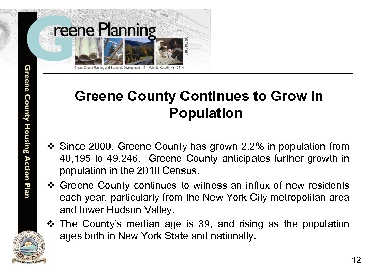 Greene County Income Distribution v 46% of residents are below 80% of Greene County median income. (Below $44, 400 for a family of four in 2008) v 21% of residents are between 80% to 120% of Greene County median income. v 33% of residents are above 120% of Greene County Median Income. 33% 46% 21% The fastest-growing sector of the population in the County is below 80% of median income. Source: 2000 Census and HUD Income Limits. Compilation of Household income statistics was prepared by River Street Planning & Development, LLC. 11
