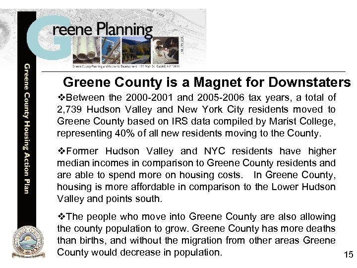 Greene County is a Magnet for Downstaters v. Between the 2000 -2001 and 2005 -2006 tax years, a total of 2, 739 Hudson Valley and New York City residents moved to Greene County based on IRS data compiled by Marist College, representing 40% of all new residents moving to the County. v. Former Hudson Valley and NYC residents have higher median incomes in comparison to Greene County residents and are able to spend more on housing costs. In Greene County, housing is more affordable in comparison to the Lower Hudson Valley and points south. v. The people who move into Greene County are also allowing the county population to grow. Greene County has more deaths than births, and without the migration from other areas Greene County would decrease in population. 15