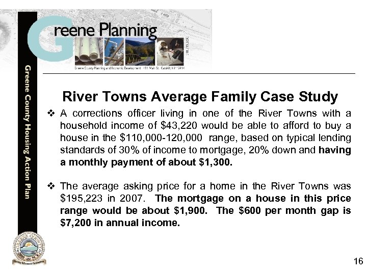 Greene County Median Housing Prices by Sub-Region v Average 2007 asking price for Greene County homes by subregion (Columbia-Greene Board of Realtors) – Historic River Towns is $195, 223 – Valley Towns is $170, 927 – Mountaintop Towns is $300, 113 v Median price of homes sold in 2007 (Greene County Real Property Tax Services): – Historic River Towns is $167, 408 – Valley Towns is $160, 000 – Mountaintop Towns is $222, 500 9