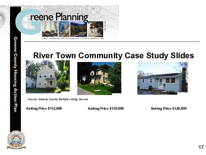 River Towns Average Family Case Study v A corrections officer living in one of the River Towns with a household income of $43, 220 would be able to afford to buy a house in the $110, 000 -120, 000 range, based on typical lending standards of 30% of income to mortgage, 20% down and having a monthly payment of about $1, 300. v The average asking price for a home in the River Towns was $195, 223 in 2007. The mortgage on a house in this price range would be about $1, 900. The $600 per month gap is $7, 200 in annual income. 16