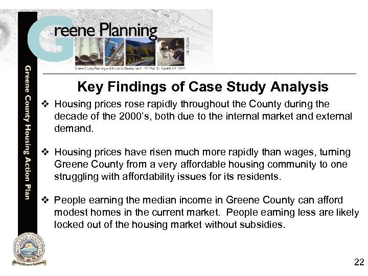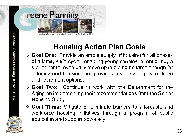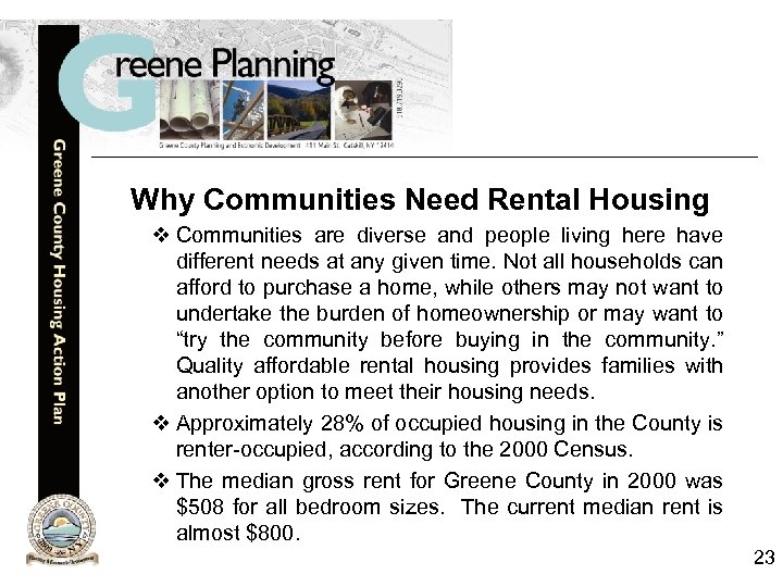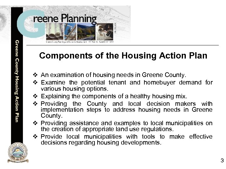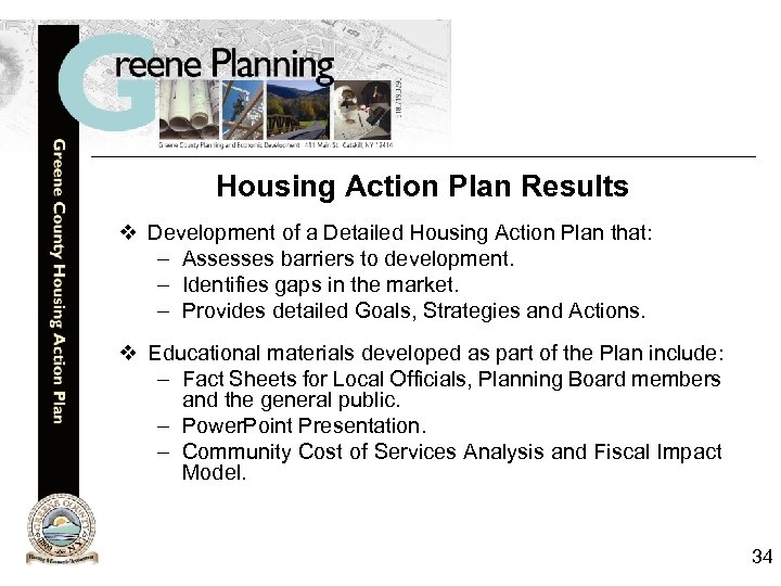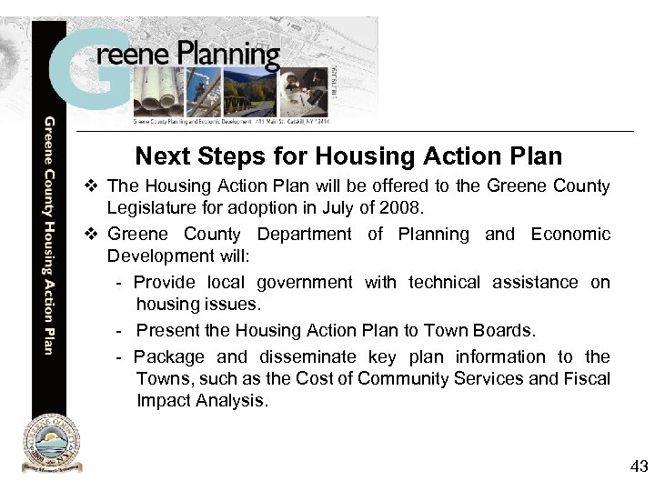 For Additional Information: Warren Hart, AICP, Director Karl Heck, AICP, Community Development Specialist Greene County Department of Planning and Economic Development (518) 719 -3290 www. greeneplanning. com The Housing Fact Sheets and Full Housing Action Plan Report is available on the website shown above. 45
