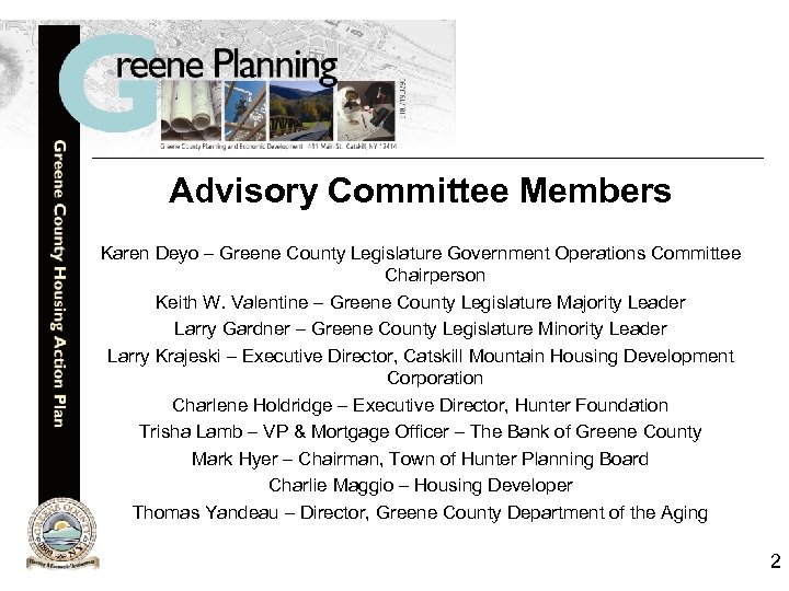 Advisory Committee Members Karen Deyo – Greene County Legislature Government Operations Committee Chairperson Keith W. Valentine – Greene County Legislature Majority Leader Larry Gardner – Greene County Legislature Minority Leader Larry Krajeski – Executive Director, Catskill Mountain Housing Development Corporation Charlene Holdridge – Executive Director, Hunter Foundation Trisha Lamb – VP & Mortgage Officer – The Bank of Greene County Mark Hyer – Chairman, Town of Hunter Planning Board Charlie Maggio – Housing Developer Thomas Yandeau – Director, Greene County Department of the Aging 2