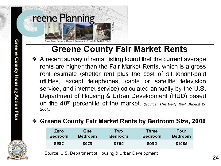 Why Communities Need Rental Housing v Communities are diverse and people living here have different needs at any given time. Not all households can afford to purchase a home, while others may not want to undertake the burden of homeownership or may want to “try the community before buying in the community. ” Quality affordable rental housing provides families with another option to meet their housing needs. v Approximately 28% of occupied housing in the County is renter-occupied, according to the 2000 Census. v The median gross rent for Greene County in 2000 was $508 for all bedroom sizes. The current median rent is almost $800. 23