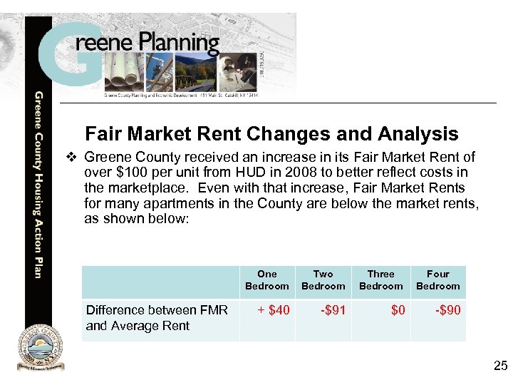 Greene County Fair Market Rents v A recent survey of rental listing found that the current average rents are higher than the Fair Market Rents, which is a gross rent estimate (shelter rent plus the cost of all tenant-paid utilities, except telephones, cable or satellite television service, and internet service) calculated annually by the U. S. Department of Housing & Urban Development (HUD) based on the 40 th percentile of the market. (Source: The Daily Mail. August 27, 2007. ) v Greene County Fair Market Rents by Bedroom Size, 2008 Zero Bedroom One Bedroom Two Bedroom Three Bedroom Four Bedroom $582 $629 $766 $996 $1085 Source: U. S. Department of Housing & Urban Development 24