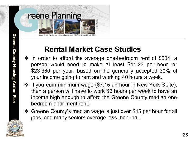 Rental Market Case Studies v In order to afford the average one-bedroom rent of $584, a person would need to make at least $11. 23 per hour, or $23, 360 per year, based on the generally accepted 30% of your income going to rent and working 40 hours a week. v If you earn minimum wage ($7. 15 an hour in New York State), then a person will have to work 63 hours per week to have an income high enough to afford the Greene County median onebedroom apartment rent. v Greene County’s median wage is just over $15 per hour for all jobs, and many sectors average less than that. 26