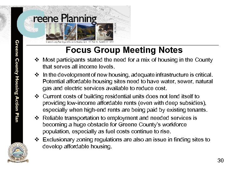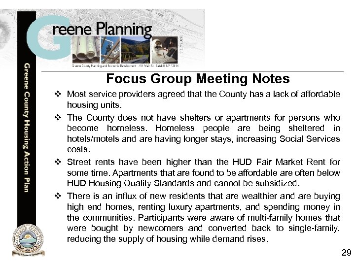 Focus Group Meeting v A focus group meeting with Greene County stakeholders was held in September 2007 to discuss housing issues facing County residents. v Invited stakeholders represented not-for-profit agencies and housing organizations, County Agencies, and Businesses and Developers. v Comments received from stakeholders were used in the preparation of the Greene County Housing Action Plan. 28