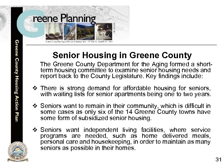 Senior Housing in Greene County The Greene County Department for the Aging formed a shortterm housing committee to examine senior housing needs and report back to the County Legislature. Key findings include: v There is strong demand for affordable housing for seniors, with waiting lists for senior apartments being one to two years. v Seniors want to remain in their community, which is difficult in some cases as only six of the 14 Greene County towns have some form of subsidized senior housing. v Seniors want independent living facilities, where service programs are needed, such as home delivered meals, personal care and housekeeping, in order to maintain as many seniors as possible in their homes. 31