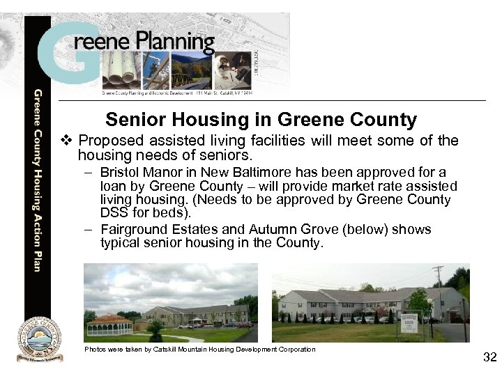 Senior Housing in Greene County v Proposed assisted living facilities will meet some of the housing needs of seniors. – Bristol Manor in New Baltimore has been approved for a loan by Greene County – will provide market rate assisted living housing. (Needs to be approved by Greene County DSS for beds). – Fairground Estates and Autumn Grove (below) shows typical senior housing in the County. Photos were taken by Catskill Mountain Housing Development Corporation 32