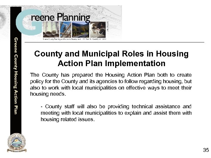 Housing Action Plan Results v Development of a Detailed Housing Action Plan that: – Assesses barriers to development. – Identifies gaps in the market. – Provides detailed Goals, Strategies and Actions. v Educational materials developed as part of the Plan include: – Fact Sheets for Local Officials, Planning Board members and the general public. – Power. Point Presentation. – Community Cost of Services Analysis and Fiscal Impact Model. 34