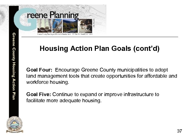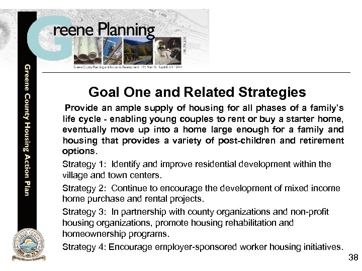 Housing Action Plan Goals (cont’d) Goal Four: Encourage Greene County municipalities to adopt land management tools that create opportunities for affordable and workforce housing. Goal Five: Continue to expand or improve infrastructure to facilitate more adequate housing. 37