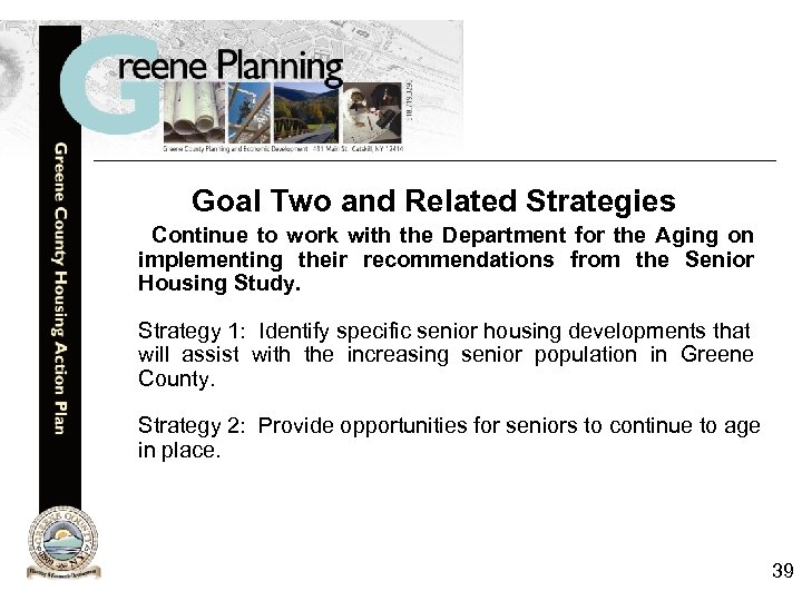 Goal Two and Related Strategies Continue to work with the Department for the Aging on implementing their recommendations from the Senior Housing Study. Strategy 1: Identify specific senior housing developments that will assist with the increasing senior population in Greene County. Strategy 2: Provide opportunities for seniors to continue to age in place. 39