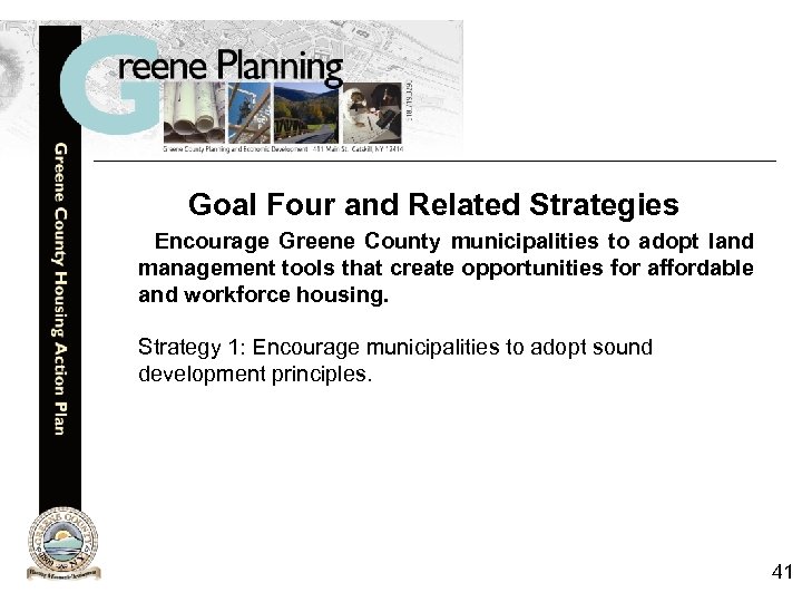 Goal Four and Related Strategies Encourage Greene County municipalities to adopt land management tools that create opportunities for affordable and workforce housing. Strategy 1: Encourage municipalities to adopt sound development principles. 41