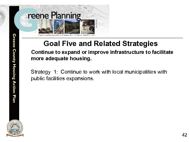 Goal Five and Related Strategies Continue to expand or improve infrastructure to facilitate more adequate housing. Strategy 1: Continue to work with local municipalities with public facilities expansions. 42