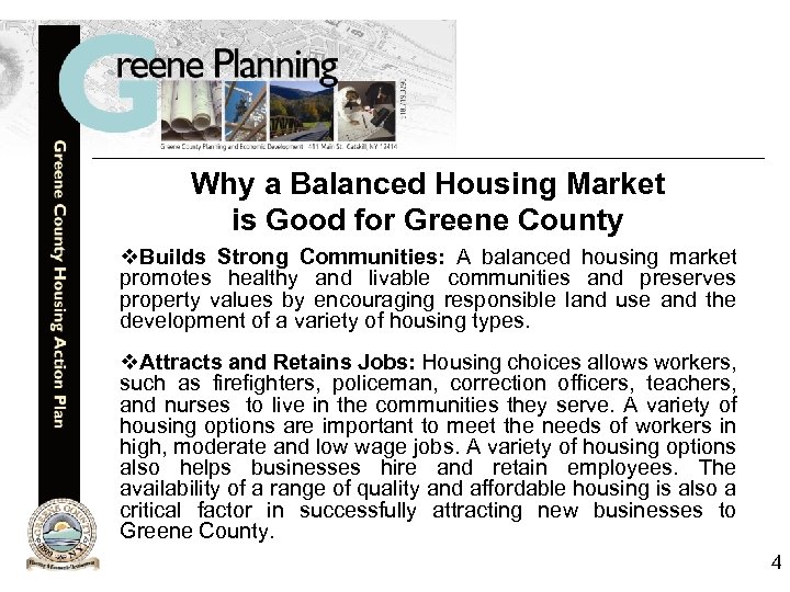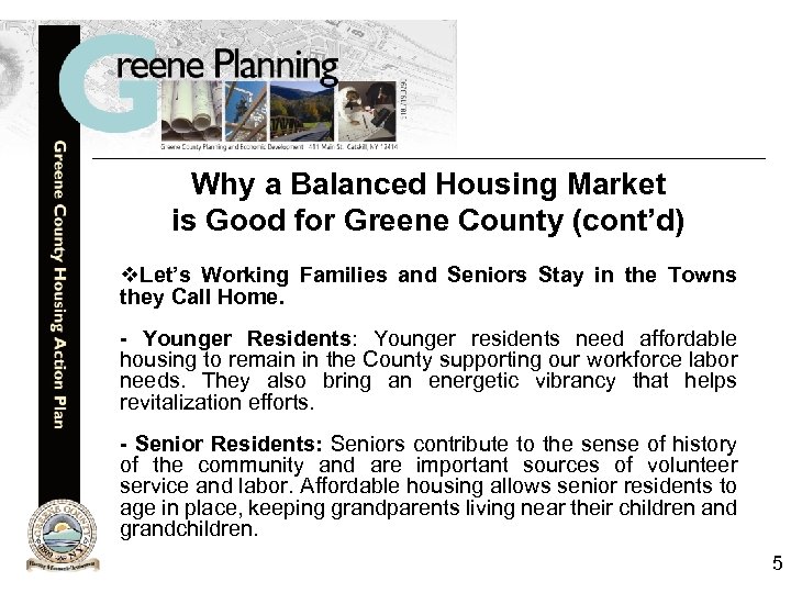 Why a Balanced Housing Market is Good for Greene County v. Builds Strong Communities: A balanced housing market promotes healthy and livable communities and preserves property values by encouraging responsible land use and the development of a variety of housing types. v. Attracts and Retains Jobs: Housing choices allows workers, such as firefighters, policeman, correction officers, teachers, and nurses to live in the communities they serve. A variety of housing options are important to meet the needs of workers in high, moderate and low wage jobs. A variety of housing options also helps businesses hire and retain employees. The availability of a range of quality and affordable housing is also a critical factor in successfully attracting new businesses to Greene County. 4