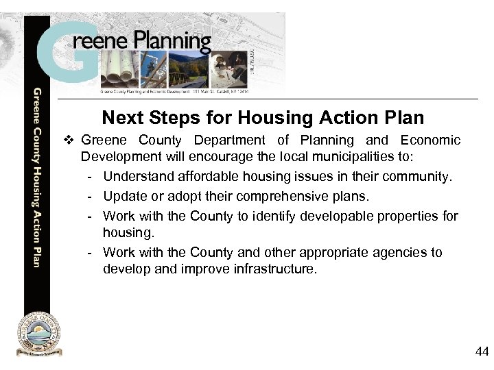 Next Steps for Housing Action Plan v The Housing Action Plan will be offered to the Greene County Legislature for adoption in July of 2008. v Greene County Department of Planning and Economic Development will: - Provide local government with technical assistance on housing issues. - Present the Housing Action Plan to Town Boards. - Package and disseminate key plan information to the Towns, such as the Cost of Community Services and Fiscal Impact Analysis. 43