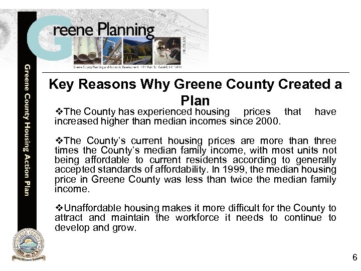 Why a Balanced Housing Market is Good for Greene County (cont’d) v. Let’s Working Families and Seniors Stay in the Towns they Call Home. - Younger Residents: Younger residents need affordable housing to remain in the County supporting our workforce labor needs. They also bring an energetic vibrancy that helps revitalization efforts. - Senior Residents: Seniors contribute to the sense of history of the community and are important sources of volunteer service and labor. Affordable housing allows senior residents to age in place, keeping grandparents living near their children and grandchildren. 5