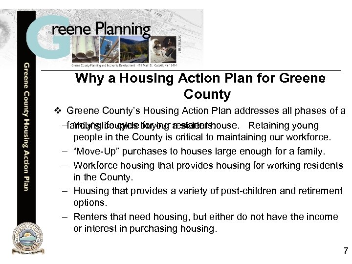 Key Reasons Why Greene County Created a Plan v. The County has experienced housing prices that increased higher than median incomes since 2000. have v. The County’s current housing prices are more than three times the County’s median family income, with most units not being affordable to current residents according to generally accepted standards of affordability. In 1999, the median housing price in Greene County was less than twice the median family income. v. Unaffordable housing makes it more difficult for the County to attract and maintain the workforce it needs to continue to develop and grow. 6