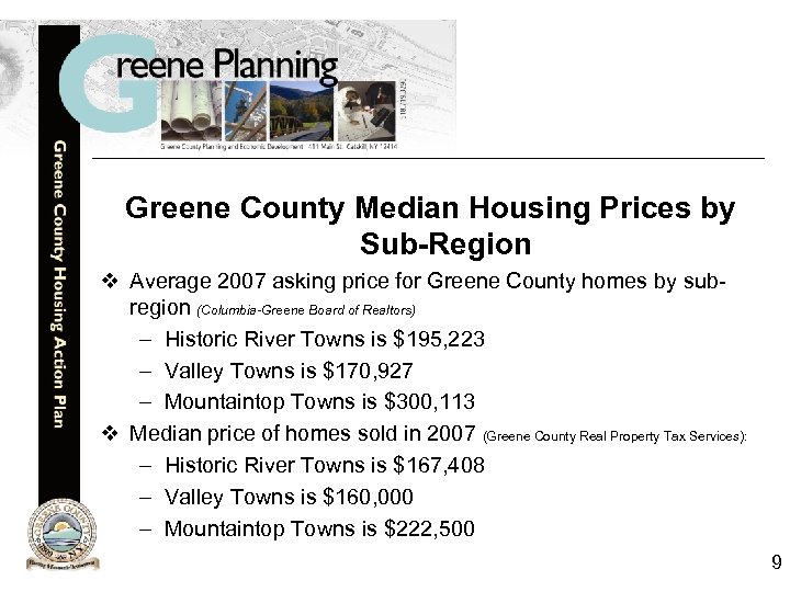 Greene County’s Dramatic Increase in Housing Prices v. Median selling price of homes in Greene County have increased 122. 8% ($78, 313 to $174, 500) from 2000 to 2006. (Source: Economic Report of the Hudson Valley Annual 2006 by Marist College) v Median family income increased only 31. 5% during the same period from $42, 200 in 2000 to $55, 500 in 2007. (Source: U. S Department of Housing and Urban Development) v. Between 2002 and 2006, Greene County experienced the highest percentage change in average housing values among the nine counties located in the Hudson Valley. (Source: Pattern for Progress – December 10, 2007 Report) 8