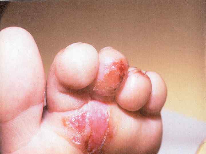Клинические формы микоза стоп: § Интертригинозная форма – поражаются межпальцевые складки стоп, кожа гиперемирована, отечна, присоединяется мокнутие и мацерация, нередко эрозии и трещины. Субъективно отмечается зуд, жжение, болезненность