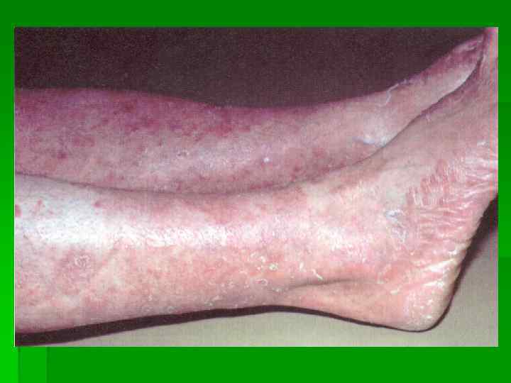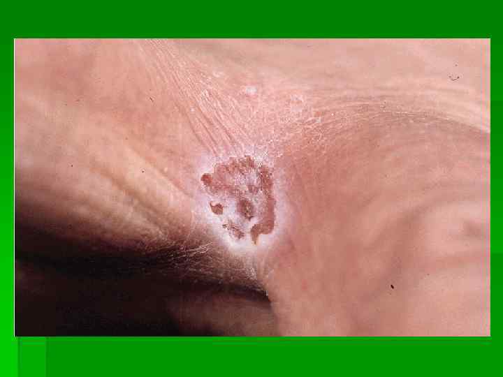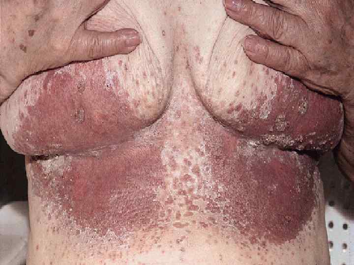 Клиника § На коже складок возникают очаги в виде пятен красно-коричневого цвета, с четкими границами, валикообразным краем § Склонный к периферичекому росту § На поверхности чешуйки § Зуд от умеренного до сильного