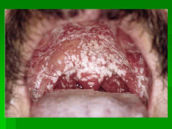 Кандидоз полости рта § Часто возникает у детей грудного возраста. Возникают налеты беловатого цвета на фоне гиперемии, сливаясь образуют пленки различной величины. § У взрослых при удалении налетов остаются эрозии. § Сухость во рту, жжение, усиливается приеме пищи