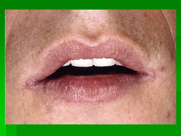 Кандидозные заеды § Поражаются оба угла рта § Слизистая имеет серовато-белую окраску, в глубине складки эрозия или трещина § Поражение может распространяться на участки кожи, прилежащие к углам рта § Кандидозный хейлит – отечность, шелушение красной каймы губ