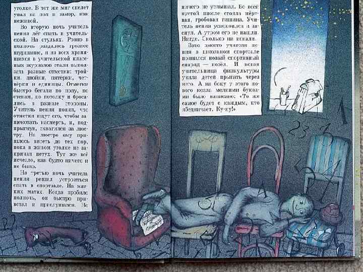 • аннотация: Однажды черной-чурной ночью в черную комнату влетела черная-пречерная перчатка. . . Примерно так начинаются все детские страшилки. Далее следует душераздирающая история, от которой волосы встают дыбом, а ноги хочется подобрать к подбородку и накрыться с головой одеялом. Писатель Григорий Остер послушал, подумал и решил: а чем он хуже каких-то малявок необразованных? Он истории получше напишет, страшнее и к тому же про школу. Тут он вспомнил детство, любимую учительницу, кабинет директора - и такого насочинял! Волосы дыбом, мурашки стадами бегают. Вот теперь и посмотрим, кто лучше умеет сочинять страшилки - дети или писатель Остер.