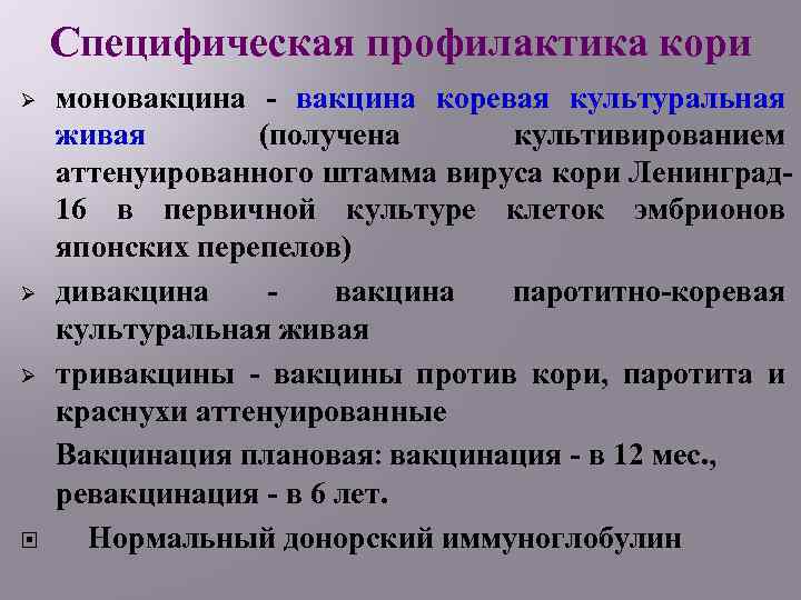 Специфическая профилактика кори Ø Ø Ø моновакцина - вакцина коревая культуральная живая (получена культивированием аттенуированного штамма вируса кори Ленинград 16 в первичной культуре клеток эмбрионов японских перепелов) дивакцина паротитно-коревая культуральная живая тривакцины - вакцины против кори, паротита и краснухи аттенуированные Вакцинация плановая: вакцинация - в 12 мес. , ревакцинация - в 6 лет. Нормальный донорский иммуноглобулин