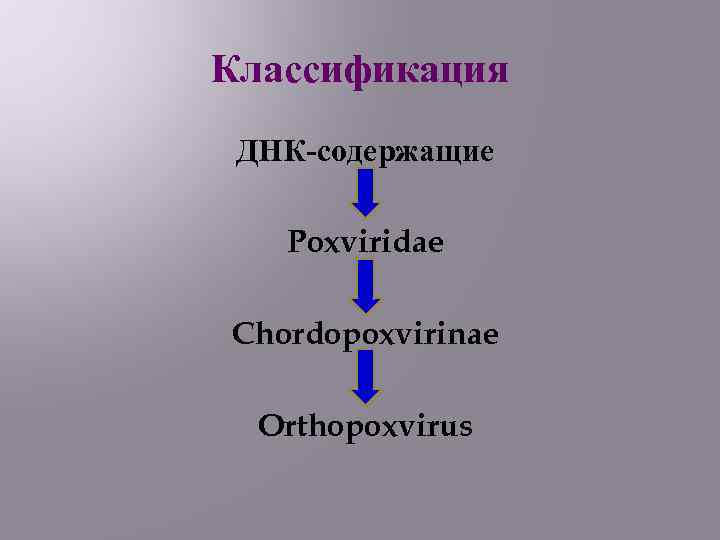 Классификация ДНК-содержащие Poxviridae Chordopoxvirinae Orthopoxvirus