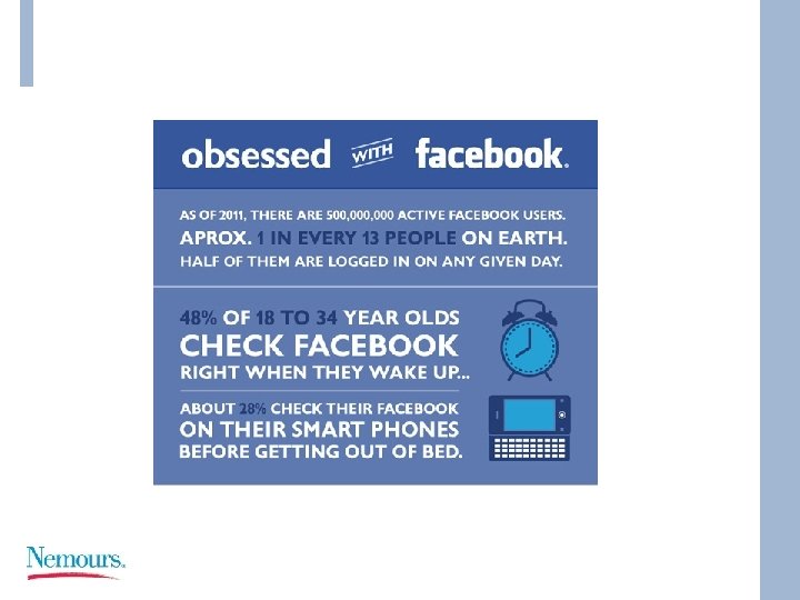 Parenting Tips § Consider creating your own account on Facebook so you can “friend” your child. That’s probably the best “monitoring tool” you could use. § You can establish a family rule that says something like, “No one can block other family members from content any of us posts on Facebook. ” § With your child, go over their friends list. Make sure your child hasn’t accepted any friend requests from total strangers. Source: www. safetyweb. com