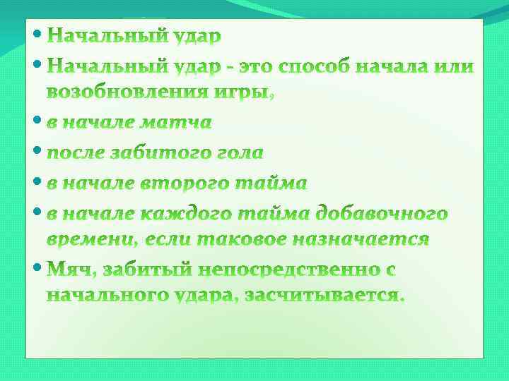 Процедура все игроки находятся на своих половинах поля игроки команды, не получившей право начального удара, находятся на расстоянии не менее 9, 15 м (10 ярдов) от мяча, до тех пор, пока мяч не будет введен в игру мяч находится в неподвижном состоянии в центре поля судья дает сигнал мяч находится в игре, когда по нему нанесен удар и он движется вперед выполнивший начальный удар игрок не имеет права вторично касаться мяча до тех пор, пока он (мяч) не коснется другого игрока После забитого одной из команд гола начальный удар выполняется игроком другой команды.