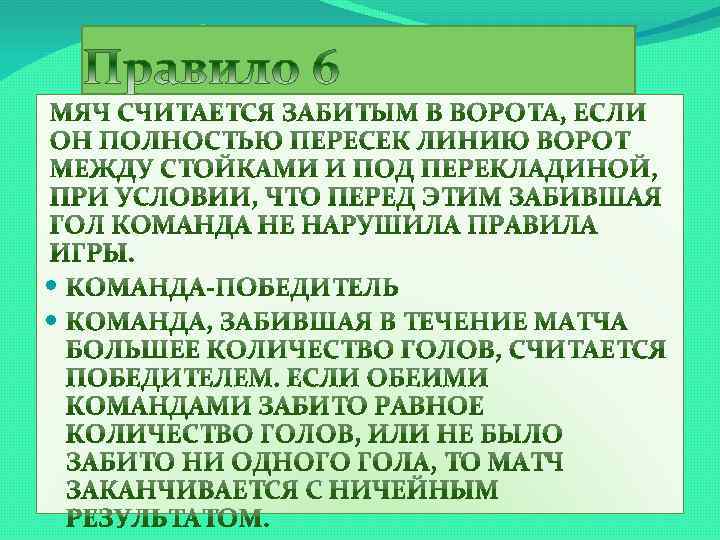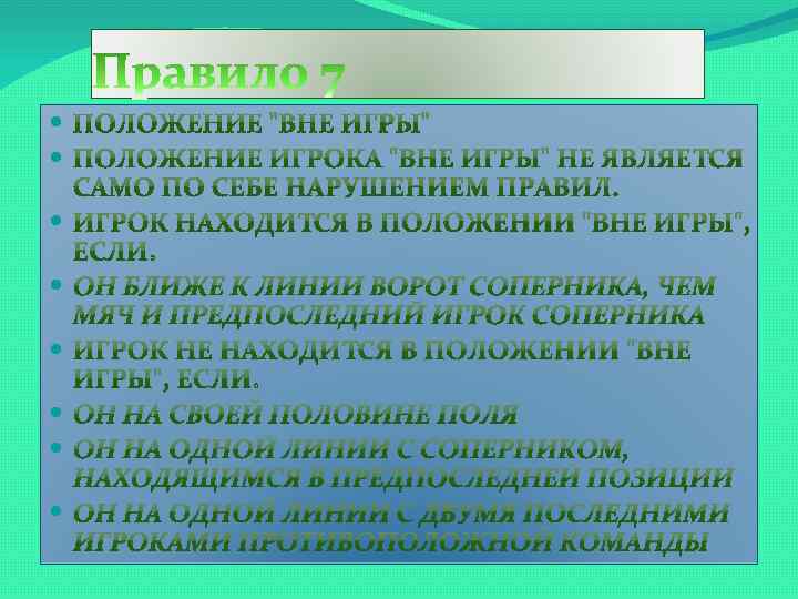 НАРУШЕНИЯ ИГРОК, НАХОДЯЩИЙСЯ В ПОЛОЖЕНИИ "ВНЕ ИГРЫ", НАКАЗЫВАЕТСЯ ЗА ЭТО ТОЛЬКО В ТОМ СЛУЧАЕ, ЕСЛИ, В МОМЕНТ КАСАНИЯ МЯЧА ИЛИ УДАРА ПО МЯЧУ КЕМ-ЛИБО ИЗ ЕГО ПАРТНЕРОВ ПО КОМАНДЕ, ОН, ПО МНЕНИЮ СУДЬИ, АКТИВНО УЧАСТВУЕТ В ИГРОВЫХ ДЕЙСТВИЯХ, А ИМЕННО: ВМЕШИВАЕТСЯ В ИГРУ МЕШАЕТ ИГРАТЬ СОПЕРНИКУ ПОЛУЧАЕТ ПРЕИМУЩЕСТВО БЛАГОДАРЯ СВОЕЙ ПОЗИЦИИ ОТСУТСТВИЕ НАРУШЕНИЯ С ТОЧКИ ЗРЕНИЯ ПОЛОЖЕНИЯ "ВНЕ ИГРЫ" НЕТ, ЕСЛИ ИГРОК ПОЛУЧАЕТ МЯЧ НЕПОСРЕДСТВЕННО ПОСЛЕ: УДАРА ОТ ВОРОТ СБРАСЫВАНИЯ ИЗ-ЗА БОКОВОЙ ЛИНИИ УГЛОВОГО УДАРА