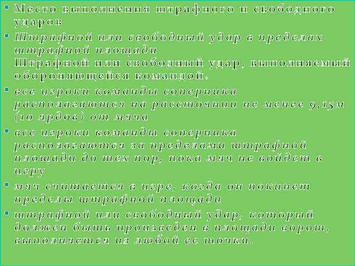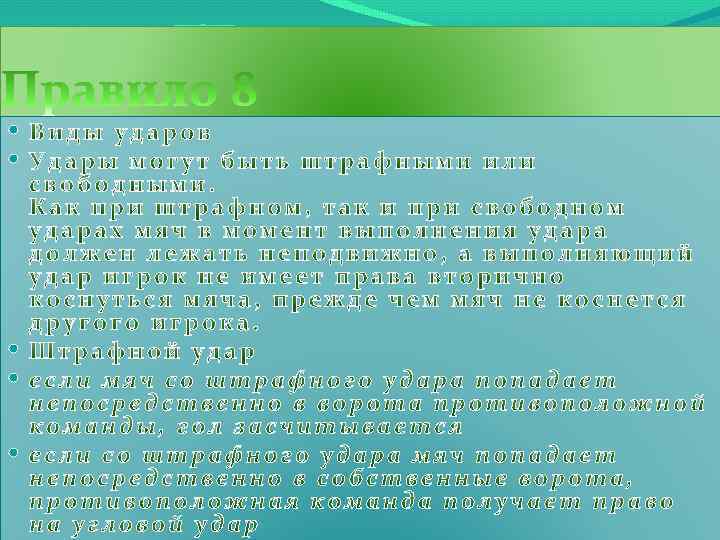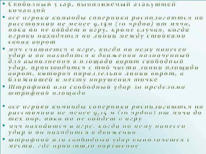 СВОБОДНЫЙ УДАР СИГНАЛ СУДЬЯ СИГНАЛИЗИРУЕТ О СВОБОДНОМ УДАРЕ ПОДНЯТИЕМ РУКИ ВВЕРХ НАД ГОЛОВОЙ. ОН ДЕРЖИТ РУКУ В ЭТОМ ПОЛОЖЕНИИ ДО ТЕХ ПОР, ПОКА УДАР НЕ БУДЕТ ВЫПОЛНЕН И МЯЧ НЕ КОСНЕТСЯ ДРУГОГО ИГРОКА ИЛИ НЕ ВЫЙДЕТ ИЗ ИГРЫ. ПОПАДАНИЕ МЯЧА В ВОРОТА МЯЧ МОЖЕТ БЫТЬ ЗАСЧИТАН ЛИШЬ В ТОМ СЛУЧАЕ, ЕСЛИ ПОСЛЕ УДАРА И ПЕРЕД ПОПАДАНИЕМ В ВОРОТА МЯЧ КОСНЕТСЯ ДРУГОГО ИГРОКА. ЕСЛИ МЯЧ СО СВОБОДНОГО УДАРА ПОПАДАЕТ ПРЯМО В ВОРОТА ПРОТИВОПОЛОЖНОЙ КОМАНДЫ, НАЗНАЧАЕТСЯ УДАР ОТ ВОРОТ ЕСЛИ СО СВОБОДНОГО УДАРА МЯЧ ПОПАДАЕТ НЕПОСРЕДСТВЕННО В СОБСТВЕННЫЕ ВОРОТА, ПРОТИВОПОЛОЖНАЯ КОМАНДА ПОЛУЧАЕТ ПРАВО НА УГЛОВОЙ УДАР