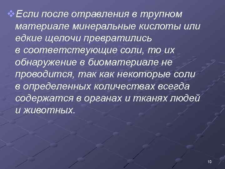 v. Если после отравления в трупном материале минеральные кислоты или едкие щелочи превратились в соответствующие соли, то их обнаружение в биоматериале не проводится, так как некоторые соли в определенных количествах всегда содержатся в органах и тканях людей и животных. 10