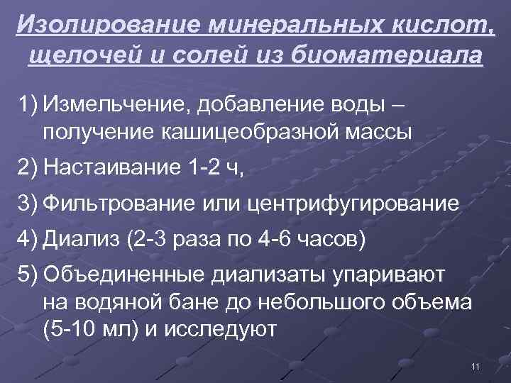 Изолирование минеральных кислот, щелочей и солей из биоматериала 1) Измельчение, добавление воды – получение кашицеобразной массы 2) Настаивание 1 -2 ч, 3) Фильтрование или центрифугирование 4) Диализ (2 -3 раза по 4 -6 часов) 5) Объединенные диализаты упаривают на водяной бане до небольшого объема (5 -10 мл) и исследуют 11