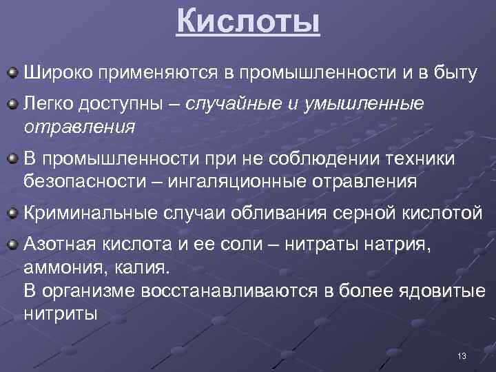 Кислоты Широко применяются в промышленности и в быту Легко доступны – случайные и умышленные отравления В промышленности при не соблюдении техники безопасности – ингаляционные отравления Криминальные случаи обливания серной кислотой Азотная кислота и ее соли – нитраты натрия, аммония, калия. В организме восстанавливаются в более ядовитые нитриты 13