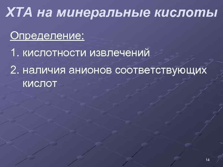 ХТА на минеральные кислоты Определение: 1. кислотности извлечений 2. наличия анионов соответствующих кислот 14