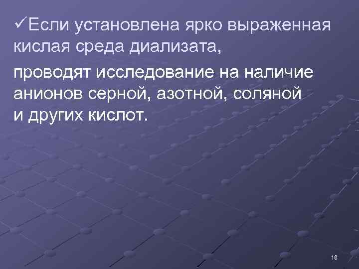 üЕсли установлена ярко выраженная кислая среда диализата, проводят исследование на наличие анионов серной, азотной, соляной и других кислот. 16