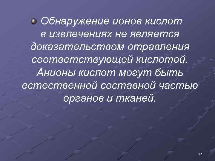Обнаружение ионов кислот в извлечениях не является доказательством отравления соответствующей кислотой. Анионы кислот могут быть естественной составной частью органов и тканей. 17