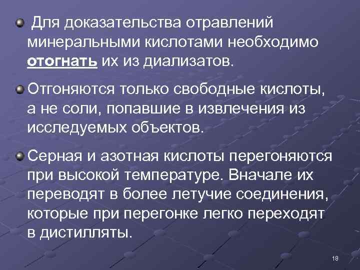 Для доказательства отравлений минеральными кислотами необходимо отогнать их из диализатов. Отгоняются только свободные кислоты, а не соли, попавшие в извлечения из исследуемых объектов. Серная и азотная кислоты перегоняются при высокой температуре. Вначале их переводят в более летучие соединения, которые при перегонке легко переходят в дистилляты. 18