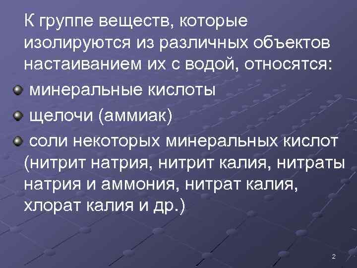 К группе веществ, которые изолируются из различных объектов настаиванием их с водой, относятся: минеральные кислоты щелочи (аммиак) соли некоторых минеральных кислот (нитрит натрия, нитрит калия, нитраты натрия и аммония, нитрат калия, хлорат калия и др. ) 2