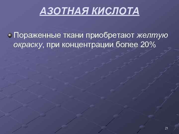 АЗОТНАЯ КИСЛОТА Пораженные ткани приобретают желтую окраску, при концентрации более 20% 21