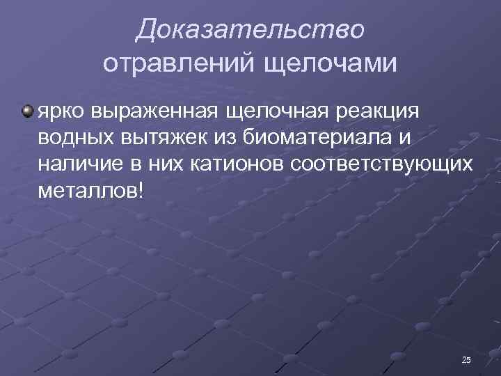 Доказательство отравлений щелочами ярко выраженная щелочная реакция водных вытяжек из биоматериала и наличие в них катионов соответствующих металлов! 25