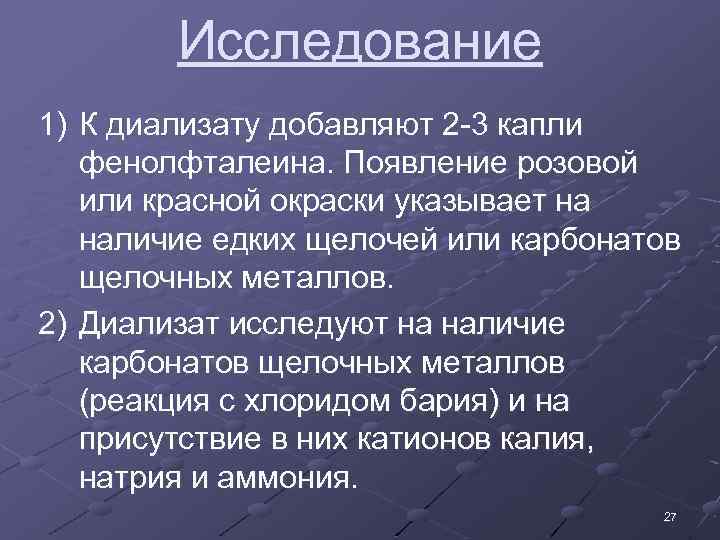 Исследование 1) К диализату добавляют 2 -3 капли фенолфталеина. Появление розовой или красной окраски указывает на наличие едких щелочей или карбонатов щелочных металлов. 2) Диализат исследуют на наличие карбонатов щелочных металлов (реакция с хлоридом бария) и на присутствие в них катионов калия, натрия и аммония. 27
