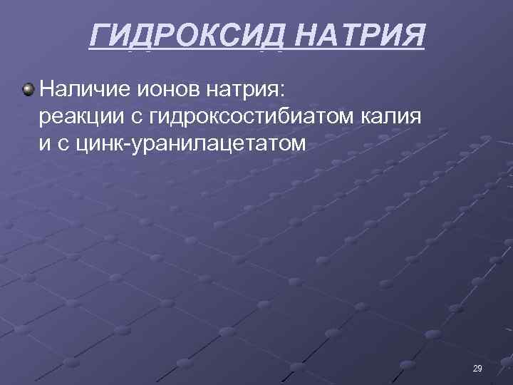 ГИДРОКСИД НАТРИЯ Наличие ионов натрия: реакции с гидроксостибиатом калия и с цинк-уранилацетатом 29