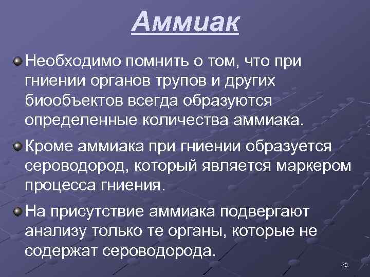 Аммиак Необходимо помнить о том, что при гниении органов трупов и других биообъектов всегда образуются определенные количества аммиака. Кроме аммиака при гниении образуется сероводород, который является маркером процесса гниения. На присутствие аммиака подвергают анализу только те органы, которые не содержат сероводорода. 30