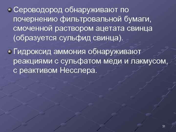 Сероводород обнаруживают по почернению фильтровальной бумаги, смоченной раствором ацетата свинца (образуется сульфид свинца). Гидроксид аммония обнаруживают реакциями с сульфатом меди и лакмусом, с реактивом Несслера. 31