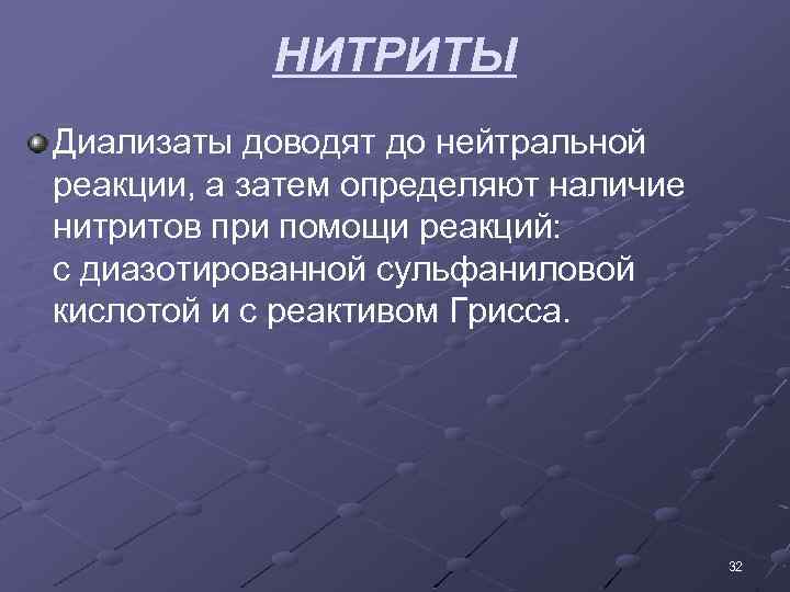 НИТРИТЫ Диализаты доводят до нейтральной реакции, а затем определяют наличие нитритов при помощи реакций: с диазотированной сульфаниловой кислотой и с реактивом Грисса. 32
