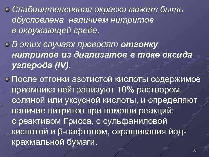 Слабоинтенсивная окраска может быть обусловлена наличием нитритов в окружающей среде. В этих случаях проводят отгонку нитритов из диализатов в токе оксида углерода (IV). После отгонки азотистой кислоты содержимое приемника нейтрализуют 10% раствором соляной или уксусной кислоты, и определяют наличие нитритов при помощи реакций: с реактивом Грисса, с сульфаниловой кислотой и β-нафтолом, окрашивания йод- крахмальной бумаги. 33