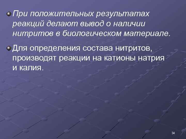При положительных результатах реакций делают вывод о наличии нитритов в биологическом материале. Для определения состава нитритов, производят реакции на катионы натрия и калия. 34